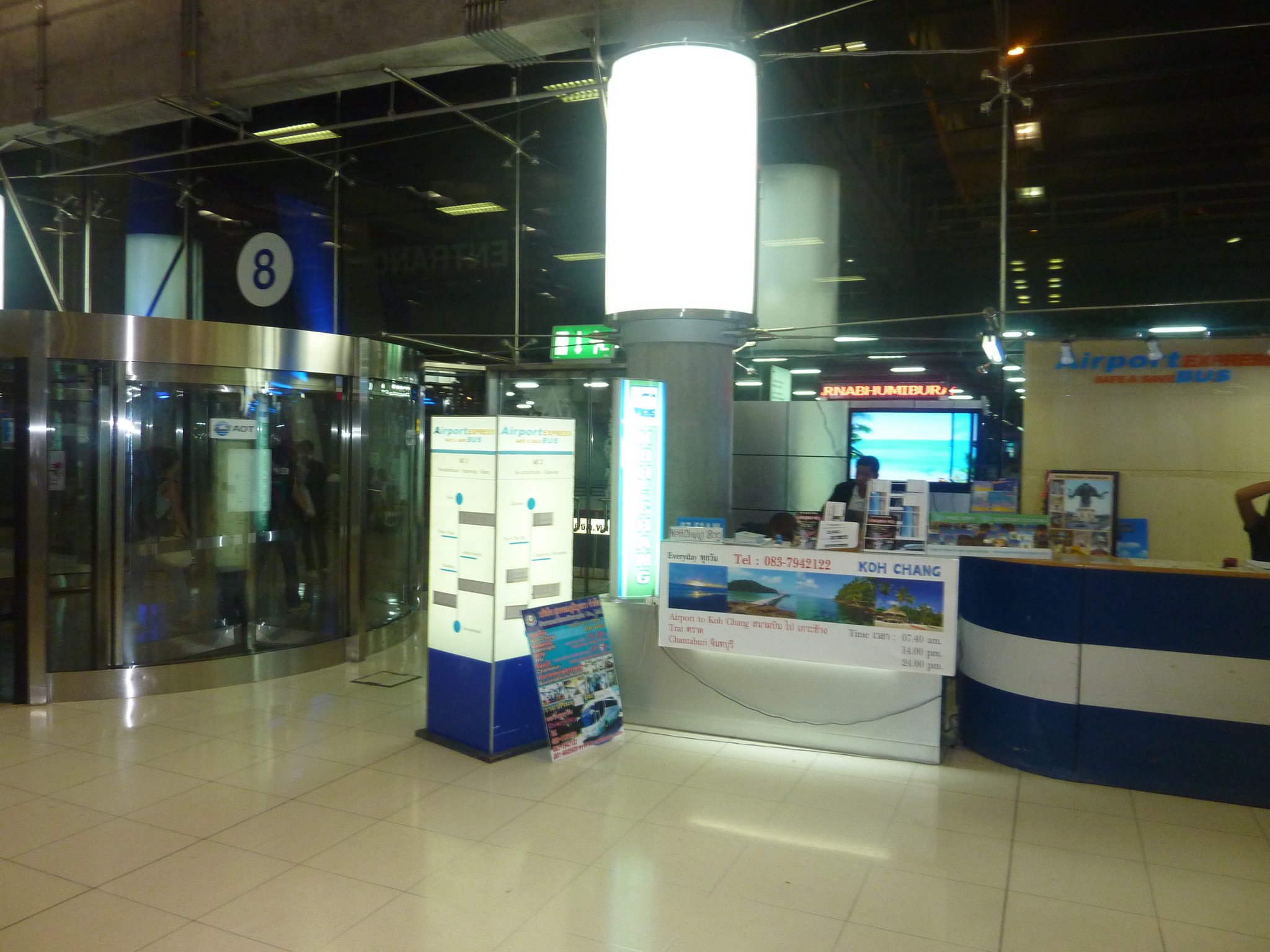 Если вы будете покупать билеты прямо в аэропорту, то посадка будет осуществляться снаружи аэропорта в районе выхода №8 на первом этаже. Стойка по продаже билетов внутри здания аэропорта, также в районе выхода №8. Найти не сложно, там крупным написано KOH CHANG (вертикальный лайтбокс и телевизор на стене). Обычно сразу указано время ближайшего рейса. Если вы прилетите рано, то вариантов конечно больше, так-то их гораздо меньше, чем в Паттайю, и в основном все до обеда, чтобы успеть на последний паром. Рейсы есть в 07:30 (большой автобус), 09:30 (может отсутствовать в низкий сезон) 11:00 и 14:00. Также можете заранее купить билеты онлайн при помощи сервиса транспорта в Азии . Ссылка сразу на нужный маршрут, можно также посмотреть наличие билетов на вашу дату (там вверху варианты недешевого такси (хотя с учетом расстояния может и нормально), а ниже в списке автобус и минибасы по доступным ценам.